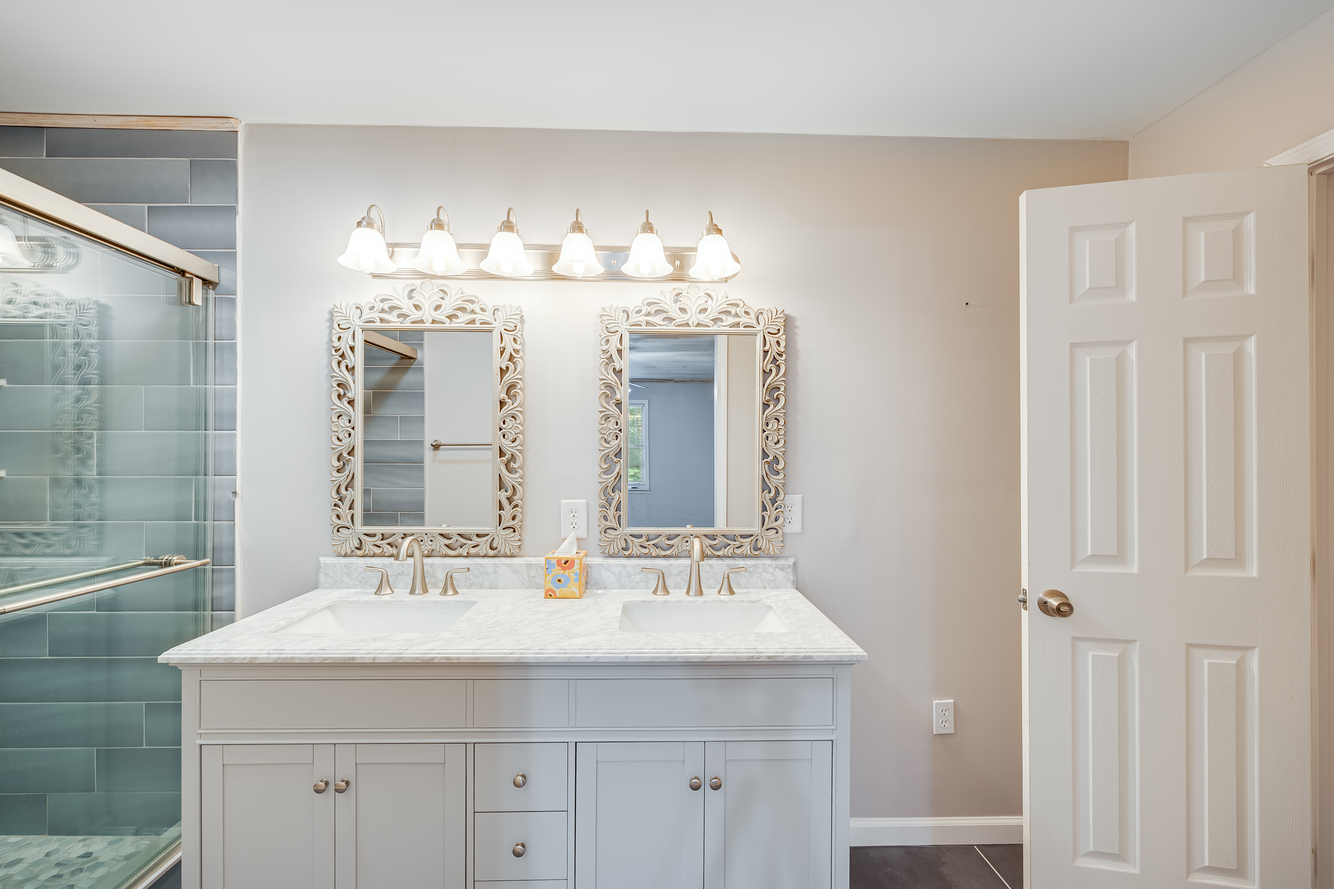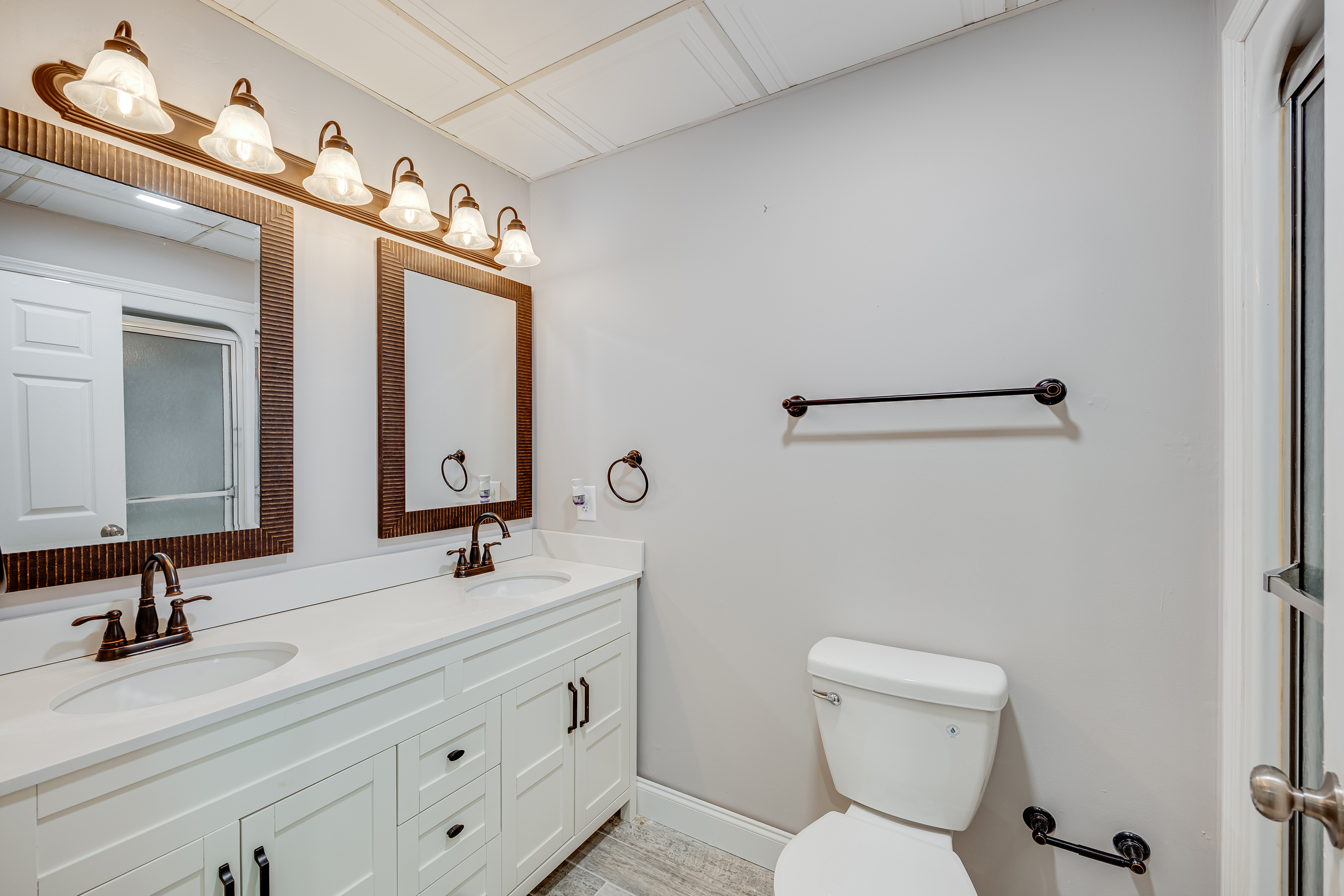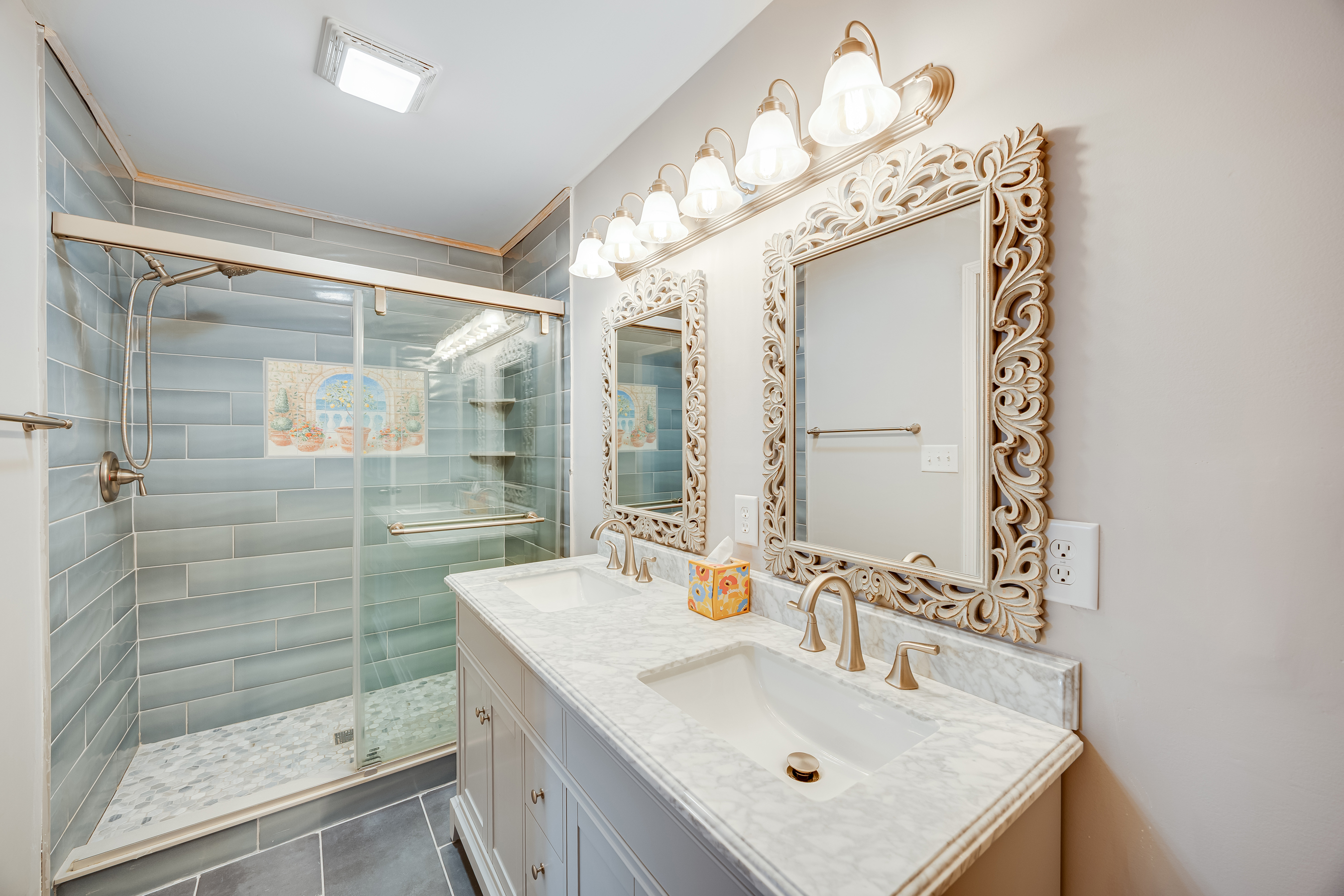 • Main level primary suite has walk-in closet and beautifully tiled shower; double vanity